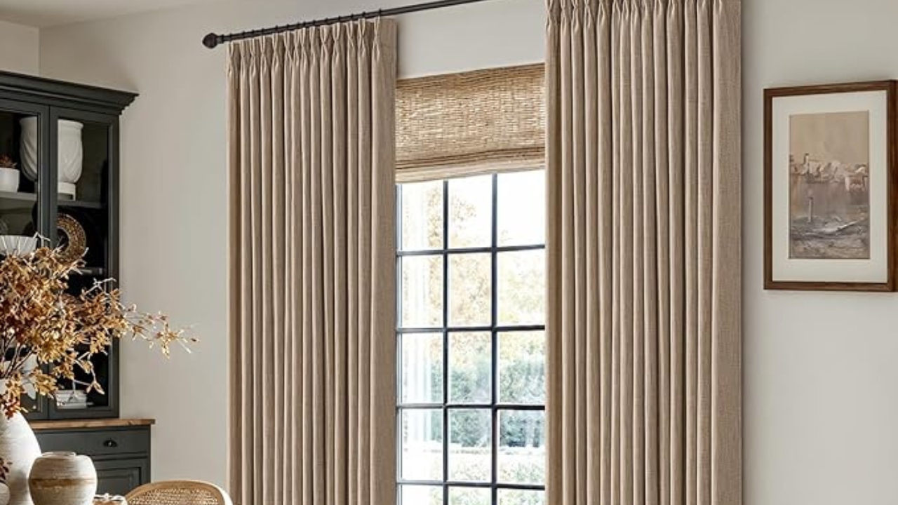 Designers almost always use linen or linen-look curtains that hang from close to the ceiling down to the floor. On Amazon, you can search for faux linen blackout or light-filtering panels in neutral colors—warm white, oatmeal, or soft gray.
