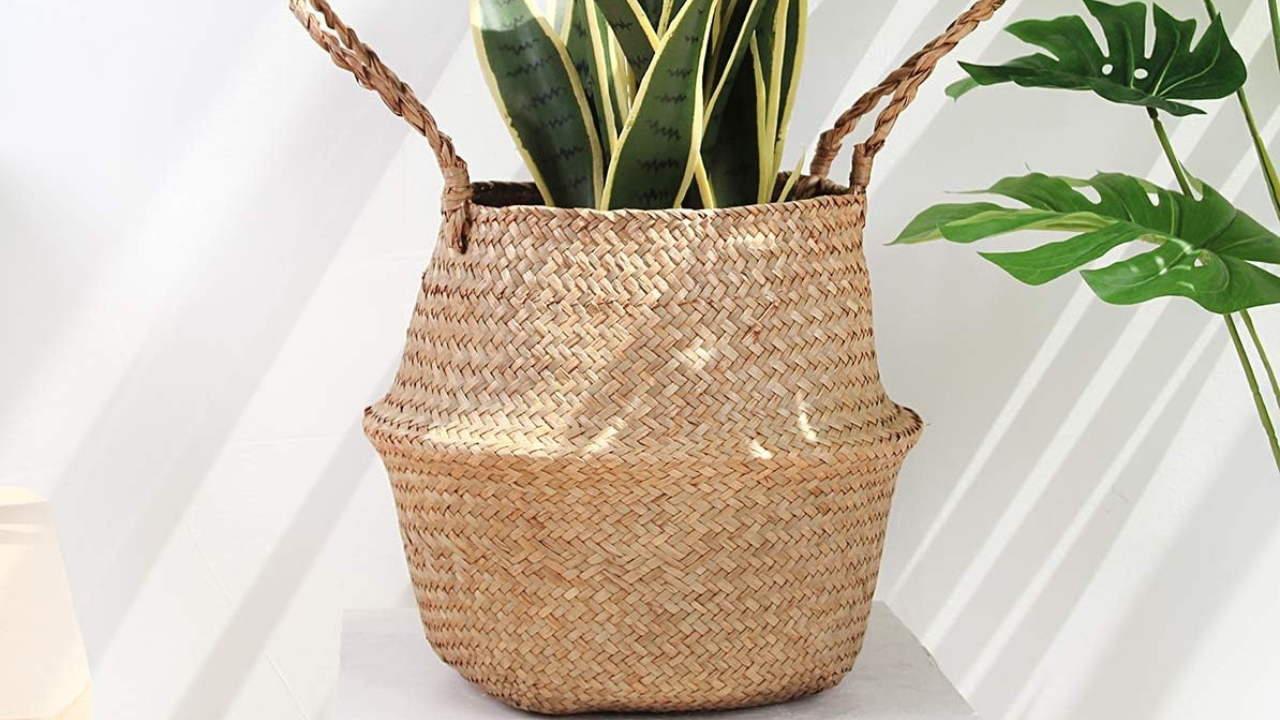 Designers love tucking clutter into seagrass baskets—for blankets, toys, plants, or throws. Amazon has a ton of sizes and shapes; belly baskets and lidded baskets both work. Stick to natural or simple patterns so they blend with what you already have.