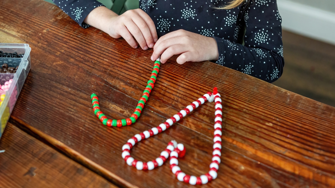 Offer red and white (or any) pony beads and pipe cleaners. Kids thread beads and then bend the top into a candy cane shape. It’s great for little hands and keeps them busy for a while.