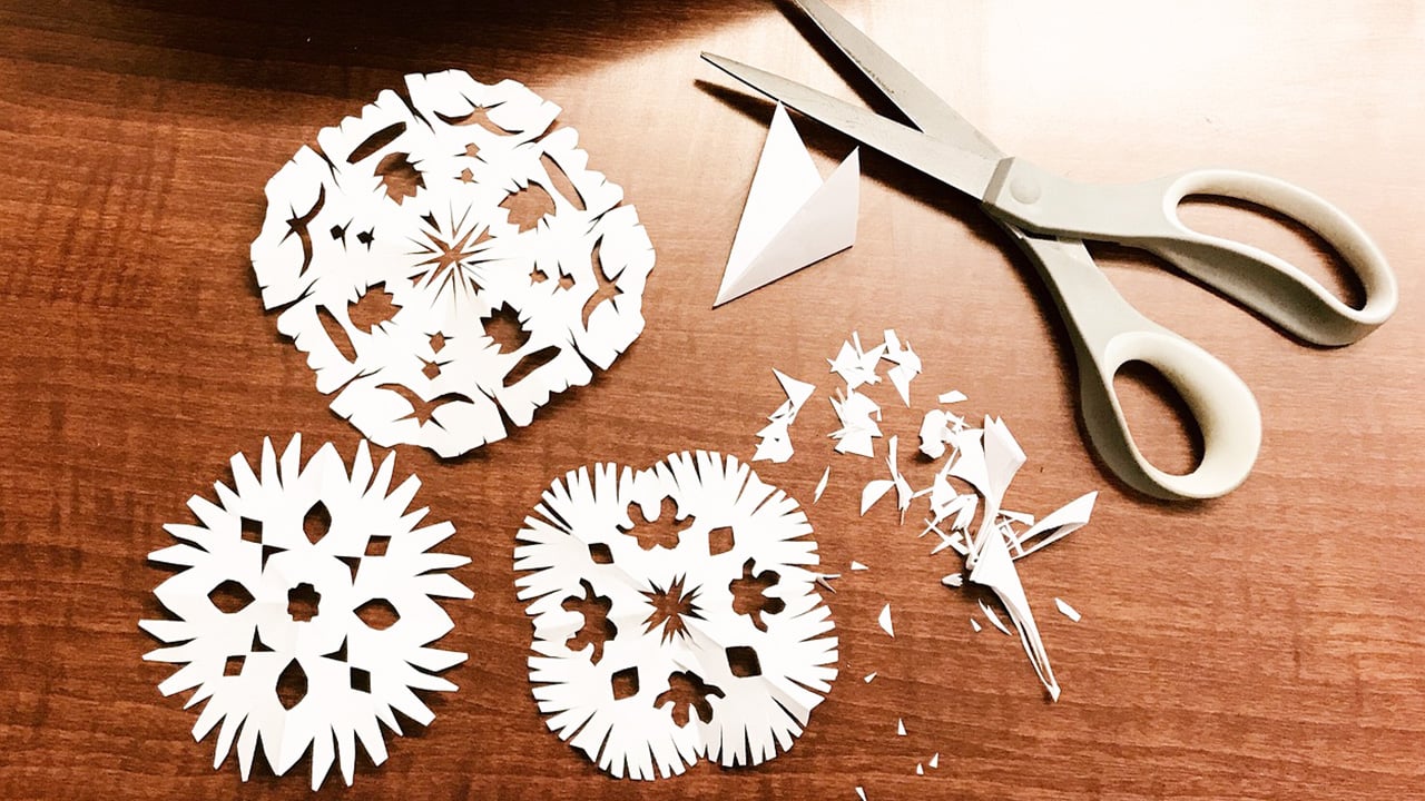 Give kids square pieces of white or colored paper and show them how to fold and snip snowflakes. Keep scissors small and blunt for younger kids.