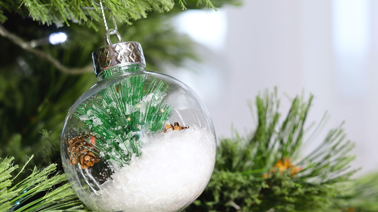 Clear plastic or glass ornaments look high-end with very little work. Fill them with small pieces of pine, tiny pinecones, dried orange peel, or a bit of ribbon. Keep it simple—one or two elements per ornament.