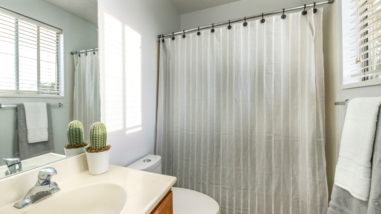 Pairing it with a curved shower rod creates more space inside the shower, which guests will notice when they use it. Look for affordable options at Walmart or IKEA that add height and dimension to the room.