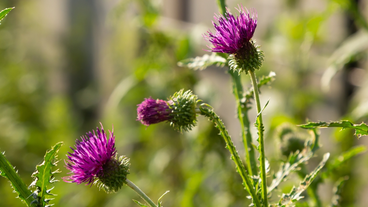 Canada thistle is a stubborn invader that can grow up to 5 feet tall. It’s easy to spot with its toothy leaves and charming lavender or pink flowers.