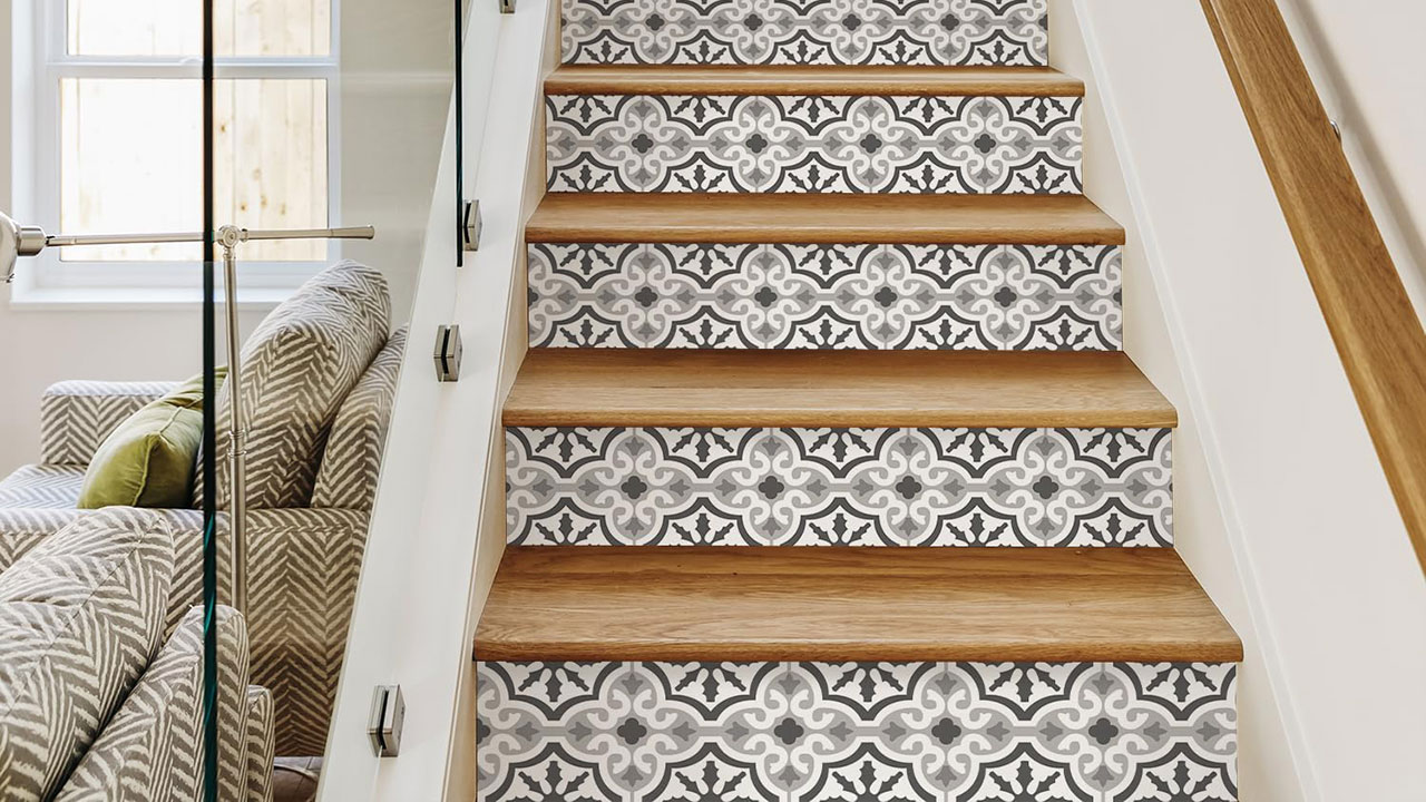 If your stairs look tired but you don’t want to paint, peel-and-stick stair decals can add a pattern or pop of color. They’re made for vertical surfaces and usually come pre-cut, so all you need is a level and a steady hand.