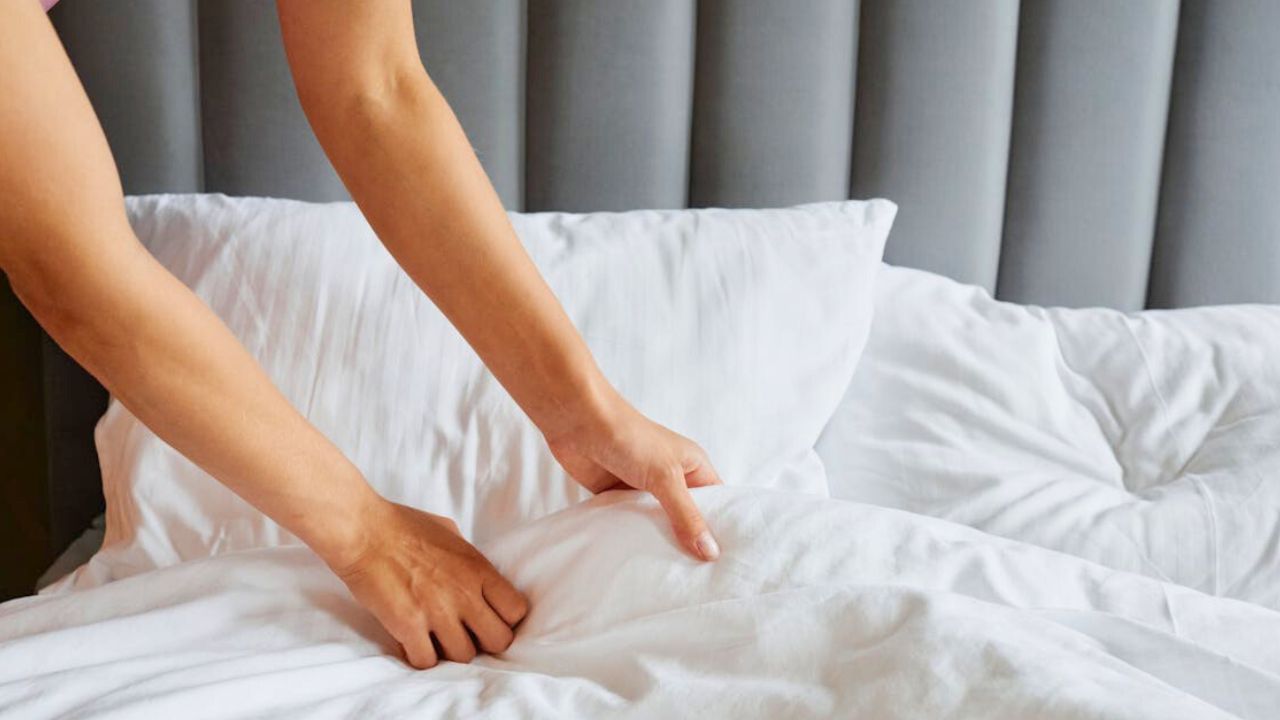 Fold the throw. Fluff pillows. Clear the tray. Click the lamp.