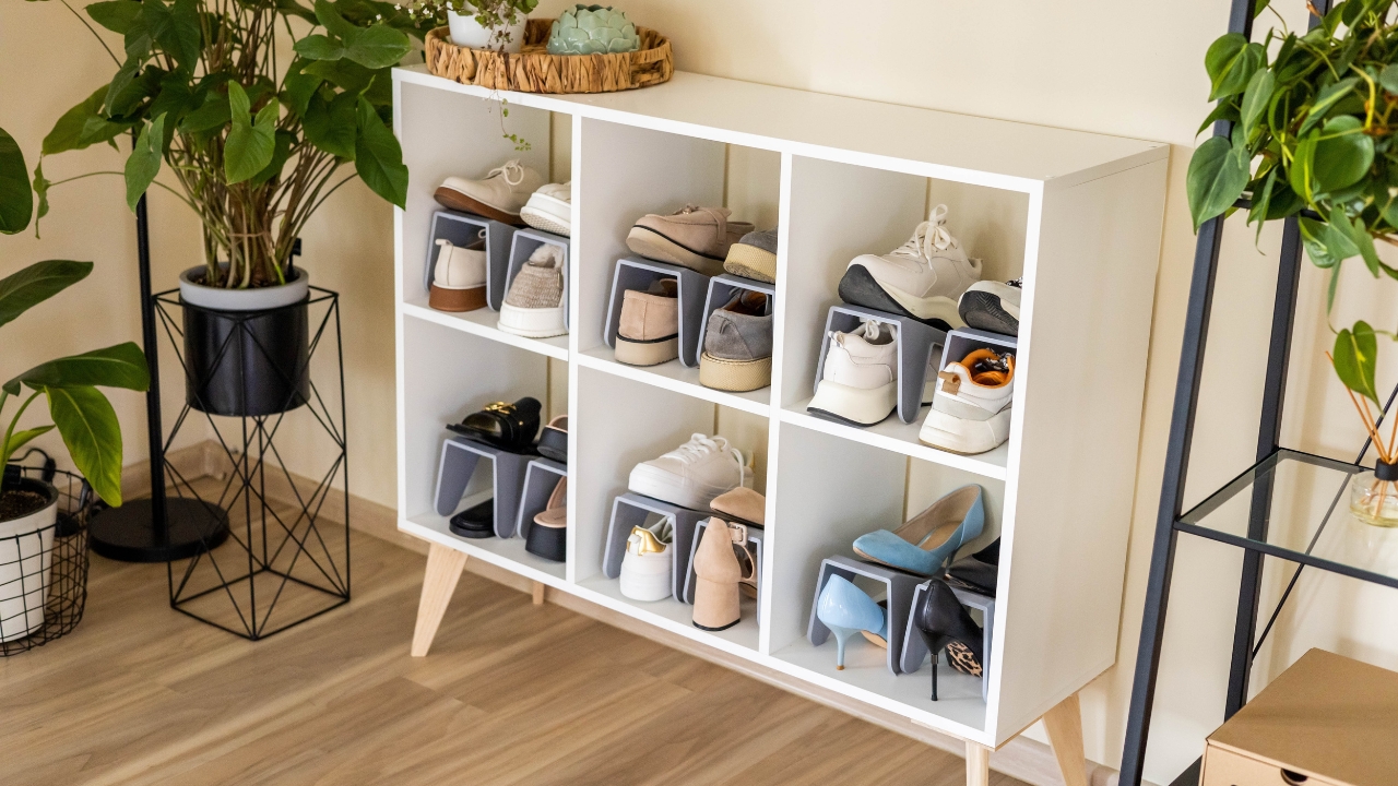 Shoes can quickly turn into a cluttered mess if you don’t have a proper spot for them. A vertical shoe rack is the answer. It organizes your shoes neatly, keeps them off the floor, and makes finding the pair you want a breeze.