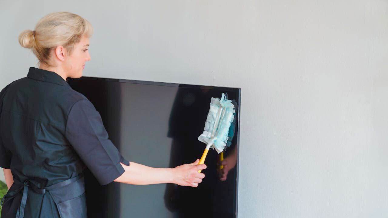 Unplug electronics once in a while, then dust the screen with a soft cloth and vacuum or wipe the surface behind and under the TV. Use a small brush attachment around cords. It doesn’t have to be perfect—you’re mainly breaking up the worst of the buildup.