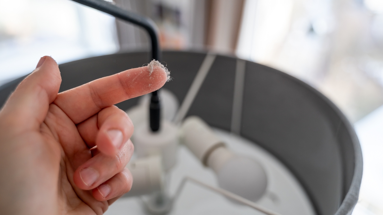 Use a lint roller or dry microfiber cloth to wipe lamp shades from top to bottom. For cords, run a cloth down them when you’re already dusting nearby surfaces. It’s not complicated, it just takes a few extra seconds when you’re in that corner anyway.