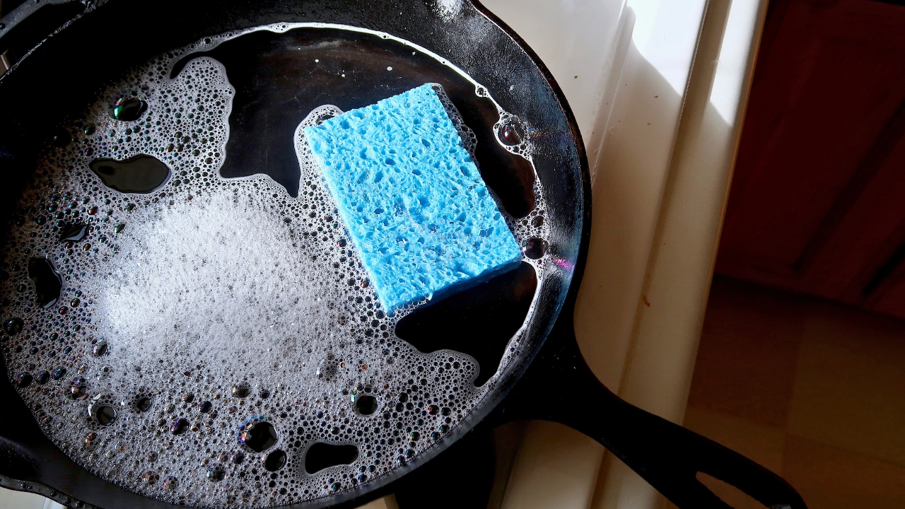 The dishwasher strips cast iron of its seasoning, leaving it dull, rough, and prone to rust. That seasoning layer is what makes your pan nonstick over time, and once it’s gone, you’ve got to start all over.