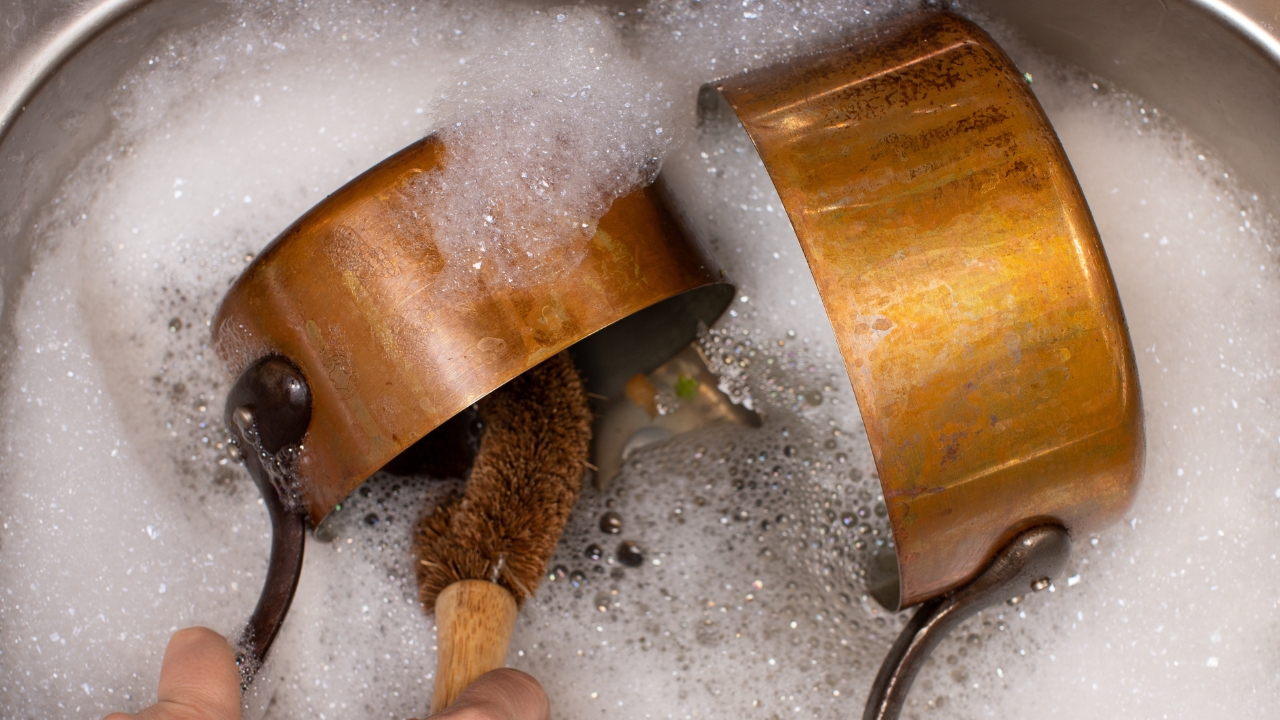Copper is sensitive to both heat and harsh soap, which can strip the finish and leave it dull or streaky. Brass and bronze react the same way. Even worse, once the protective coating is gone, they’ll tarnish faster.