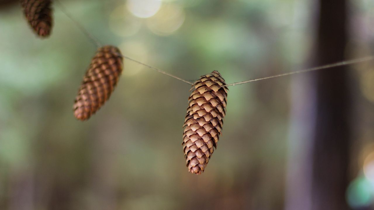 Tie pinecones onto twine or thin rope, spacing them every few inches. You can tie directly around the top of the cone or use small screws/hooks if you want something sturdier.