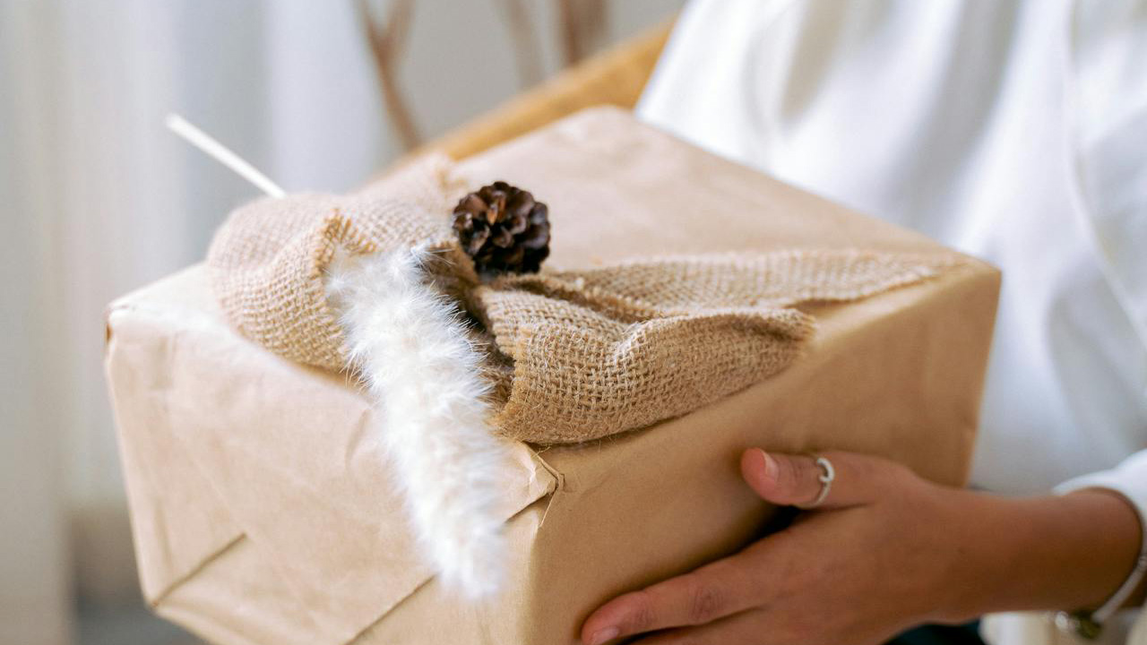 Tie a small pinecone to the center of a bow on a wrapped gift. You can add a little greenery or ribbon strip if you want it more dressed up.