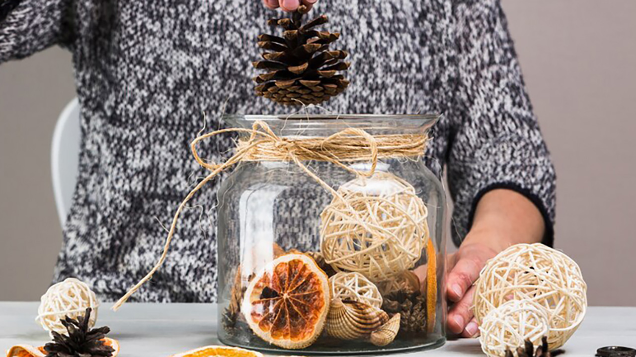 Glue a few small pinecones around the base of a jar or vase, then tie a ribbon or jute string above them. Add a candle or greenery inside the jar.