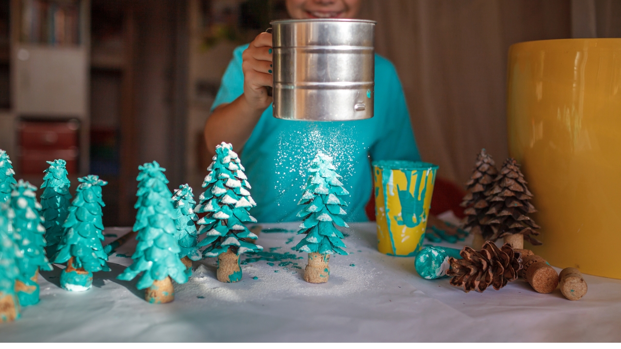 Glue smaller pinecones upside down on wooden blocks, jar lids, or small slices of wood so they stand upright. You can leave them natural or lightly brush the “tips” with green or white paint.