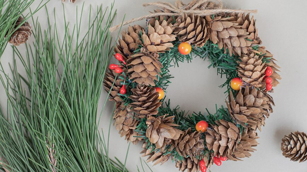 Glue pinecones onto a wreath form (foam, wire, or even heavy cardboard). Start with a base layer, then fill gaps with smaller cones.