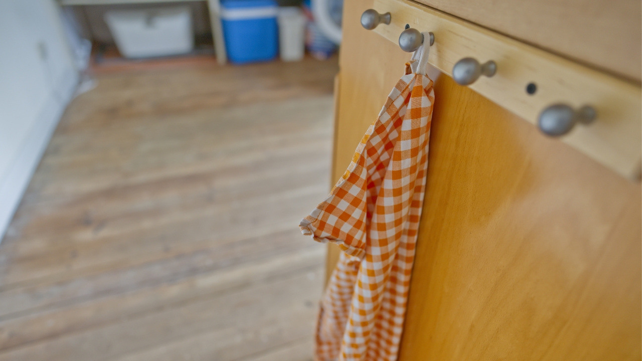 We hung a few small hooks inside cabinet doors and on the side of our pantry for things like oven mitts, measuring spoons, and grocery bags.