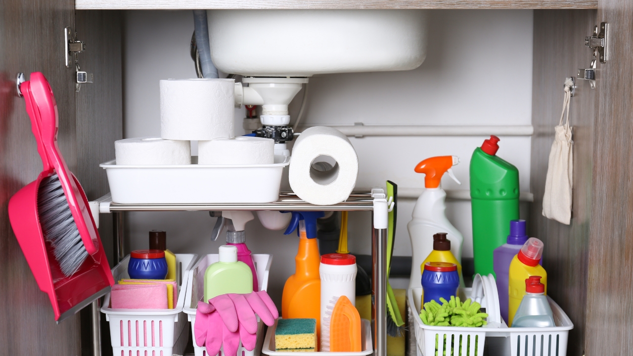 The cabinet under our sink used to be a black hole of cleaning products. We added a tension rod to hang spray bottles, and it cleared up space fast.
