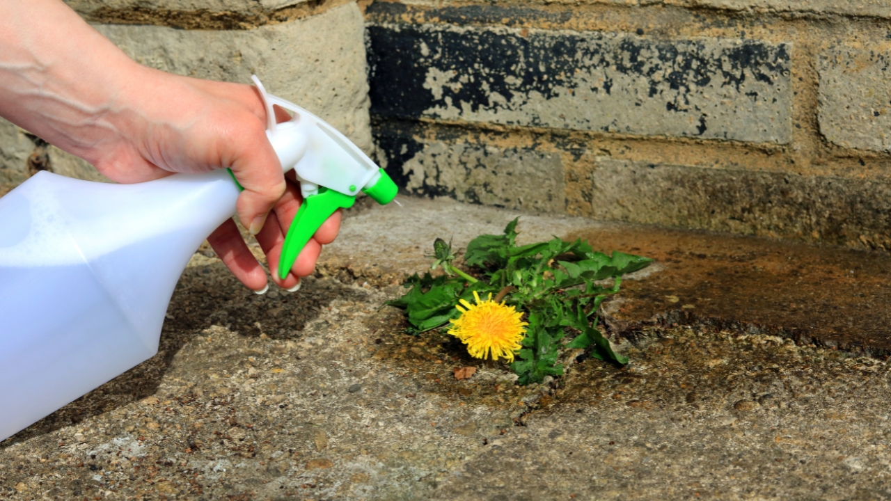 We mix vinegar with a little dish soap to help it stick. Spray on a hot, sunny day when there’s no rain coming. It won’t hit deep taproots, but it works fast on the little stuff.