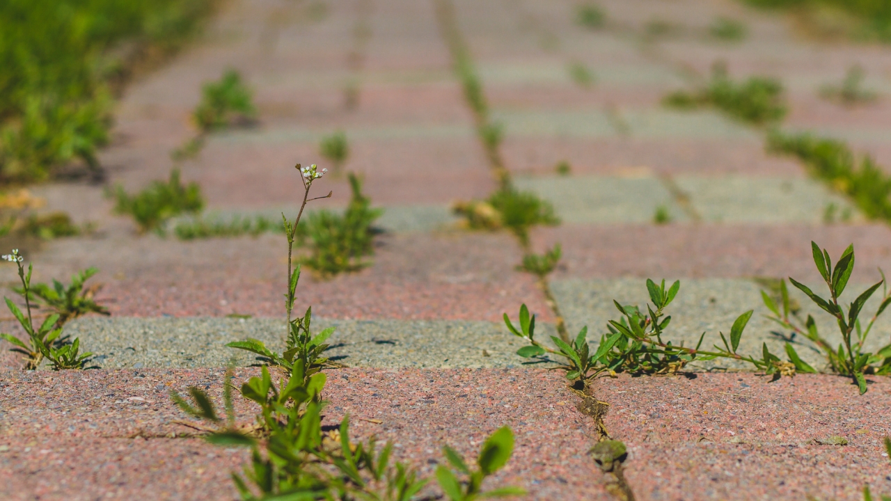 For weeds growing in sidewalks, patios, or gravel paths, boiling water does the trick. It kills the weed right down to the root without chemicals. Cheap and effective.