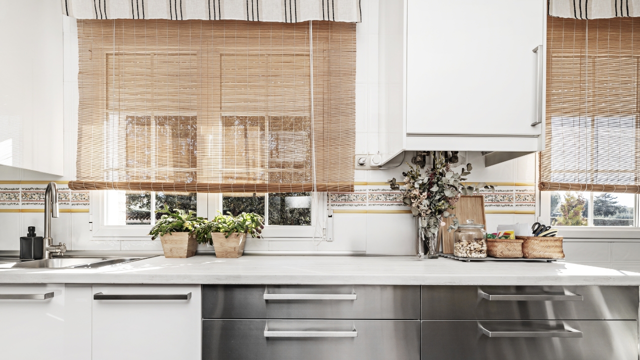 Bare or outdated windows can make the whole space feel off. A fitted roman shade, bamboo blind, or even a café curtain gives your kitchen a more complete look.