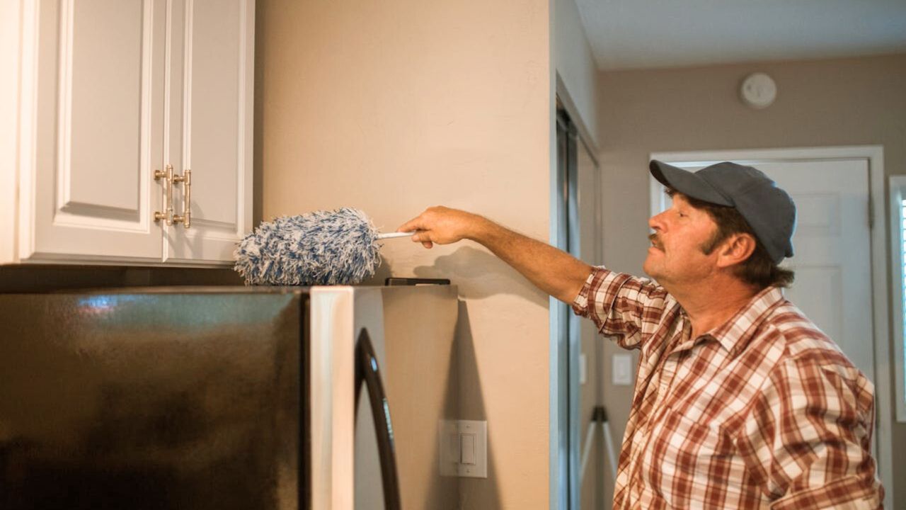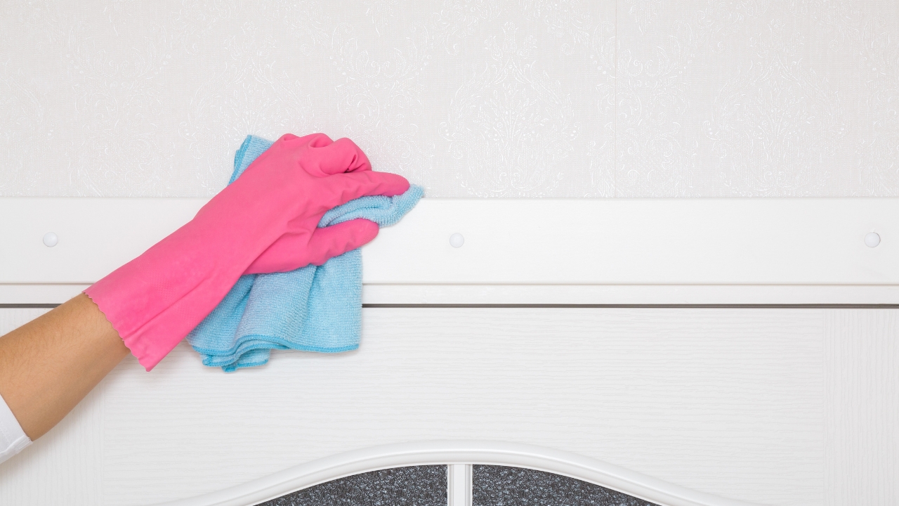 Use a step stool and a microfiber cloth or duster to wipe them down. If cabinet tops are especially grimy, lay down wax paper or liner afterward to make the next cleanout easier.
