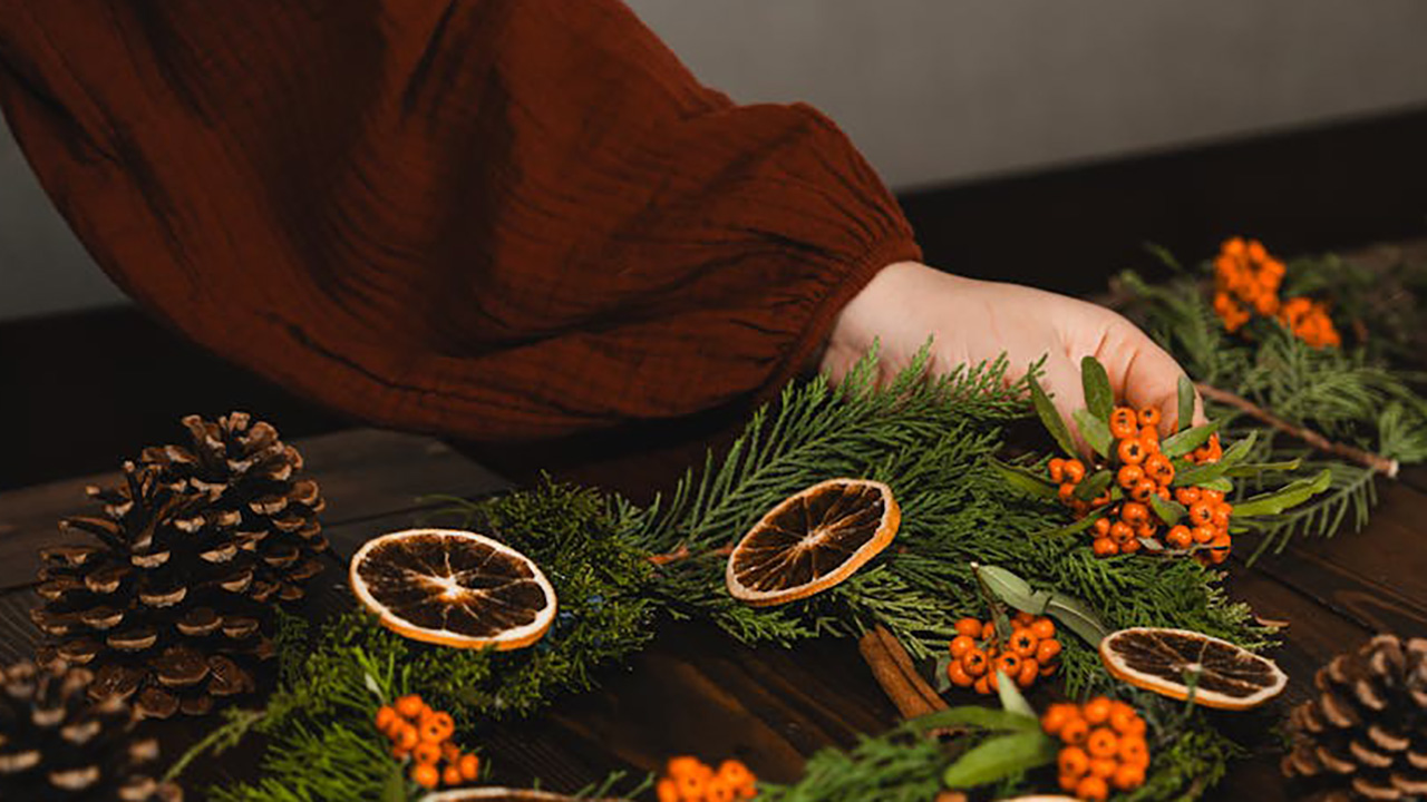 Fresh or preserved eucalyptus stems bring soft color and a clean scent. They layer nicely with red berries, pine, and candles on a mantel or dining table. The leaves add shape and movement without feeling heavy or cluttered.