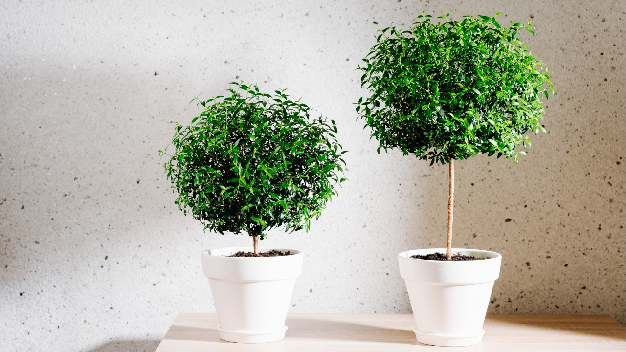 Myrtle topiaries are smaller and a little more delicate-looking than boxwood. They bring a structured, European feel to side tables or kitchen counters. They do best with bright light and consistent moisture, so they suit spots you walk past often.