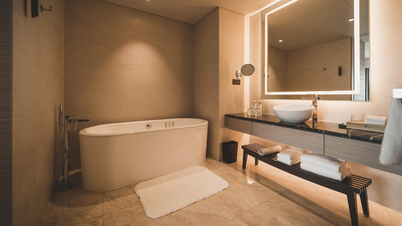Stick to textures and tones you’d see in a hotel—white, beige, or soft gray. The consistency and quality make your bathroom feel clean, calm, and upscale without a single major change.