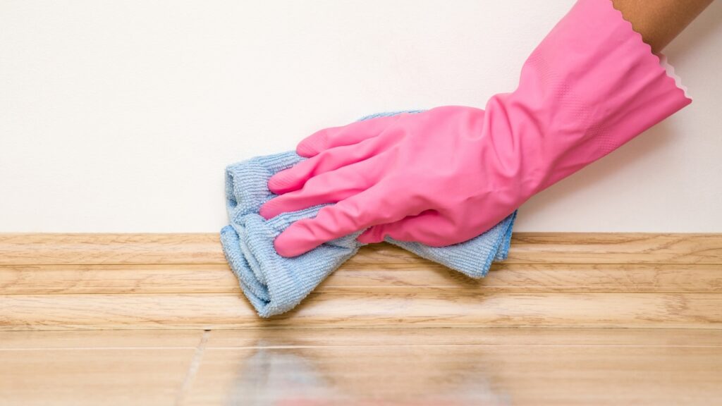 Baseboards collect more grime than most people notice. Use warm water with a little dish soap or vinegar and a microfiber cloth to wipe them down. A magic eraser works great for scuffs and shoe marks without stripping paint.