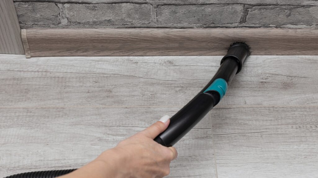Dirt builds up right where the baseboard meets the floor. Use a small brush or vacuum attachment to clean the line where carpet or tile meets the trim.