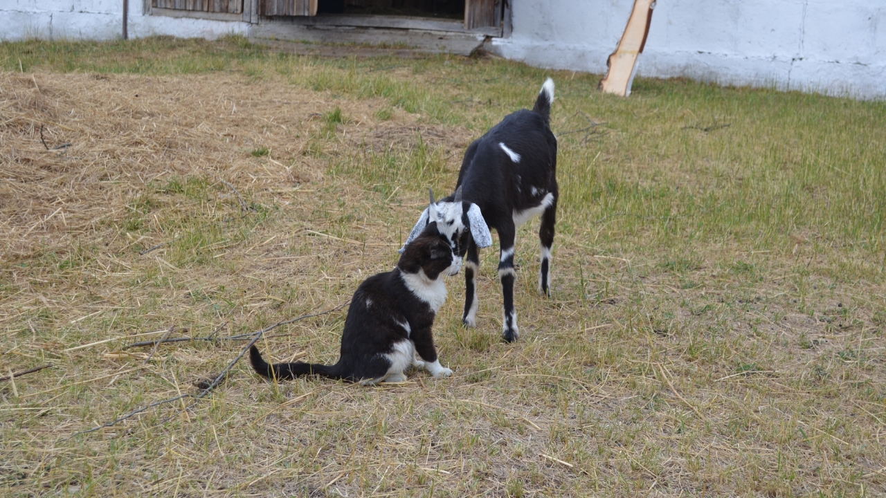 Goats and cats often learn to coexist in the barnyard. Goats won’t usually bother cats, and some will even settle down next to them for warmth. Cats seem to appreciate the steady presence of a goat herd.