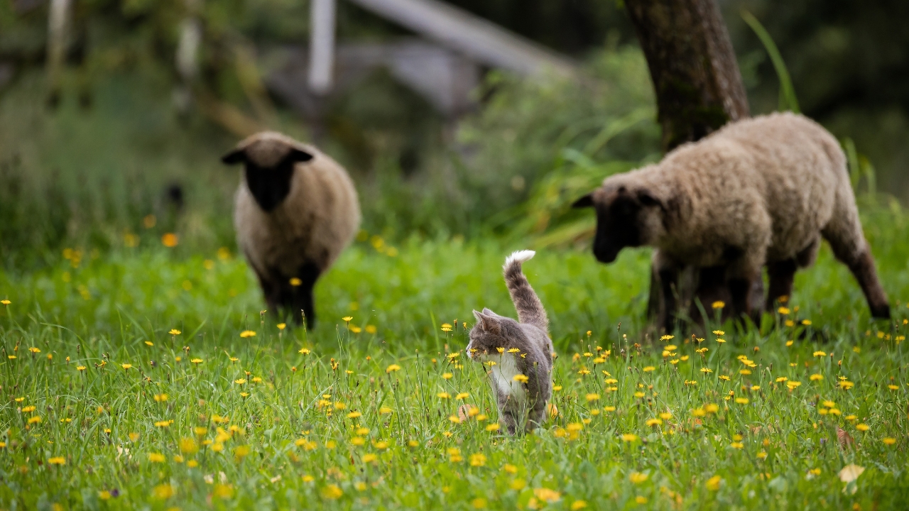 Sheep are tolerant as long as cats don’t spook them. Over time, they’ll accept cats weaving through their legs or resting nearby.