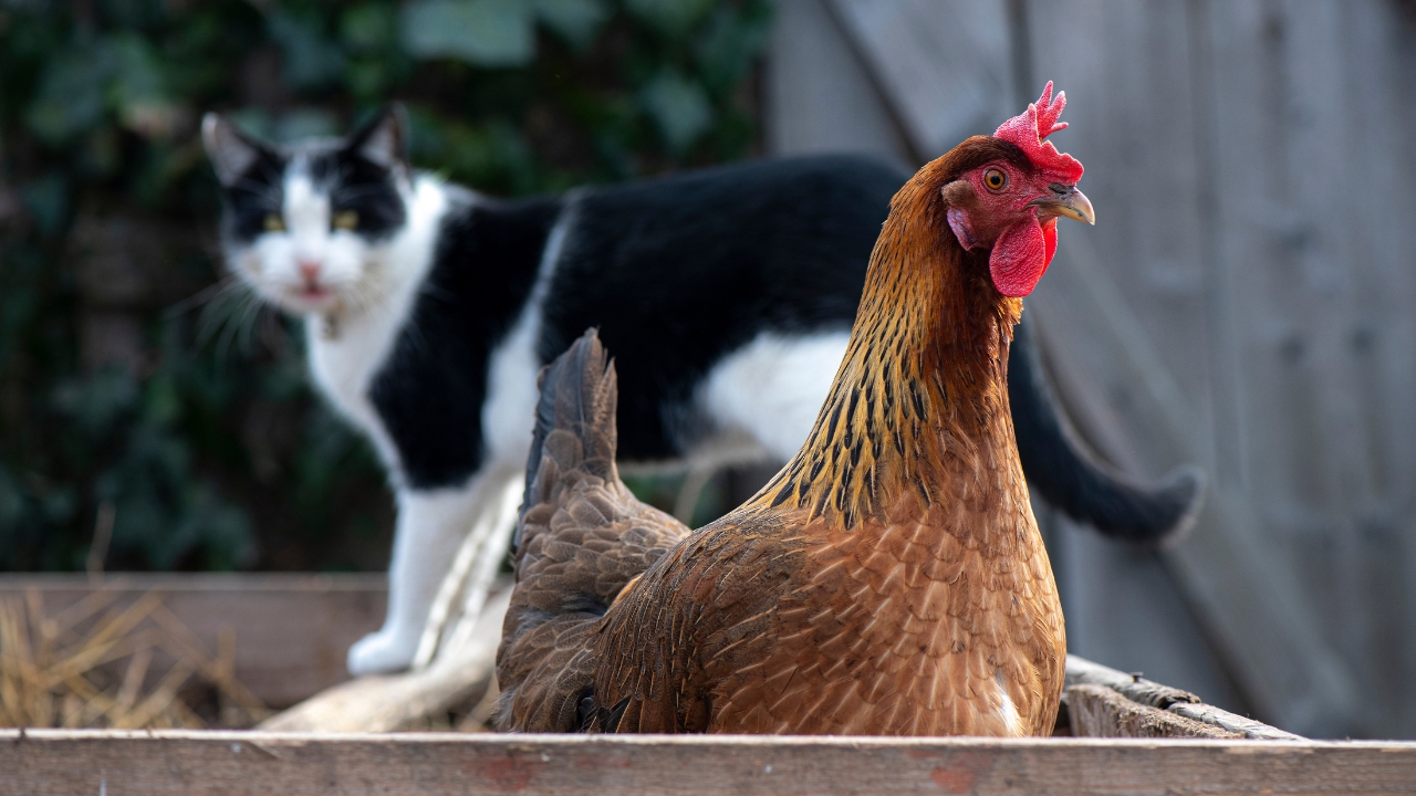 While cats aren’t a natural match for chickens, they can coexist if the cats are raised around them and the birds are full-grown.