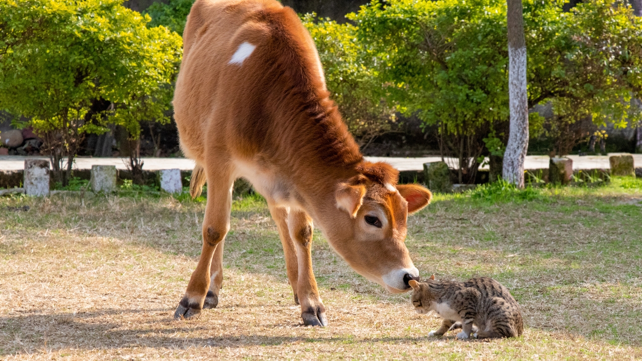 Cows are generally calm around cats. Calves may be curious and follow cats around, while older cattle tend to ignore them entirely.
