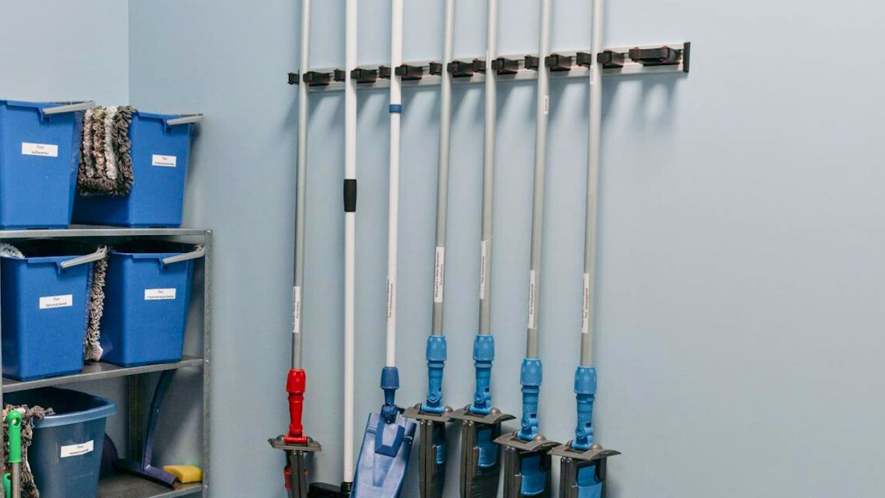 If brooms, mops, and the Swiffer are always sliding around in a closet or piled behind the door, a wall-mounted broom holder will make you weirdly happy. It usually has grippy slots for handles and a few hooks for dustpans or small tools.