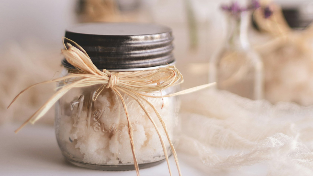Stir white sugar and a neutral oil (like coconut or light olive oil) until it’s the texture of damp sand. Add a drop or two of vanilla or citrus if you use scents, and spoon it into a cleaned glass jar. Wipe the rim so it’s neat and screw the lid on tight.