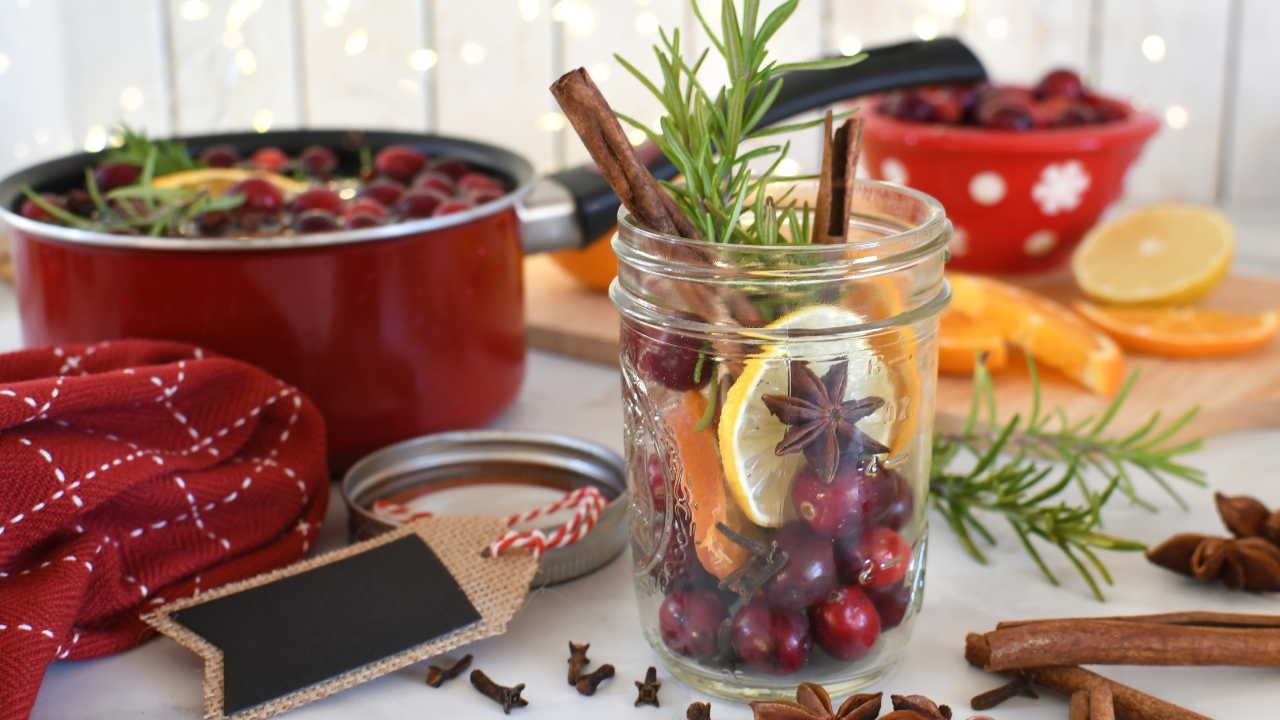 Fill a clear glass jar or bottle with dried orange slices, a cinnamon stick or two, whole cloves, and a small piece of rosemary or evergreen. Keep the mix simple and repeat the same combo for each gift so they all look cohesive.