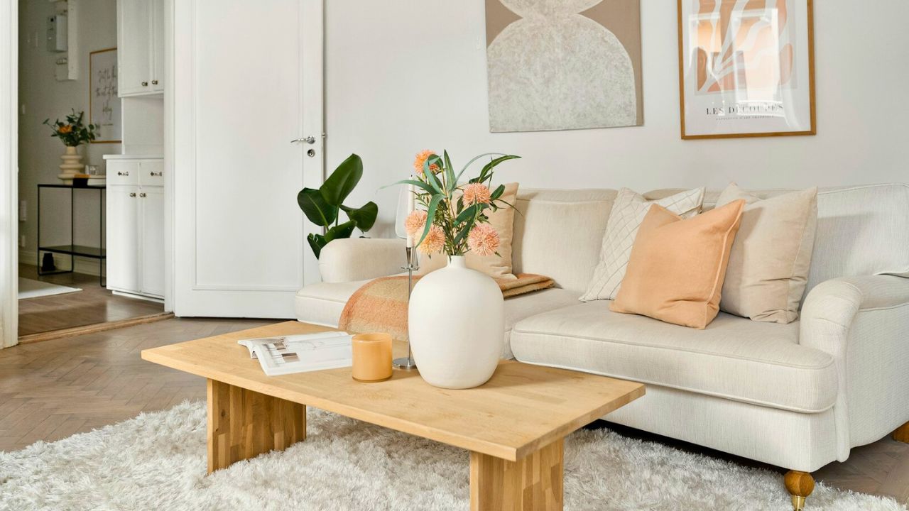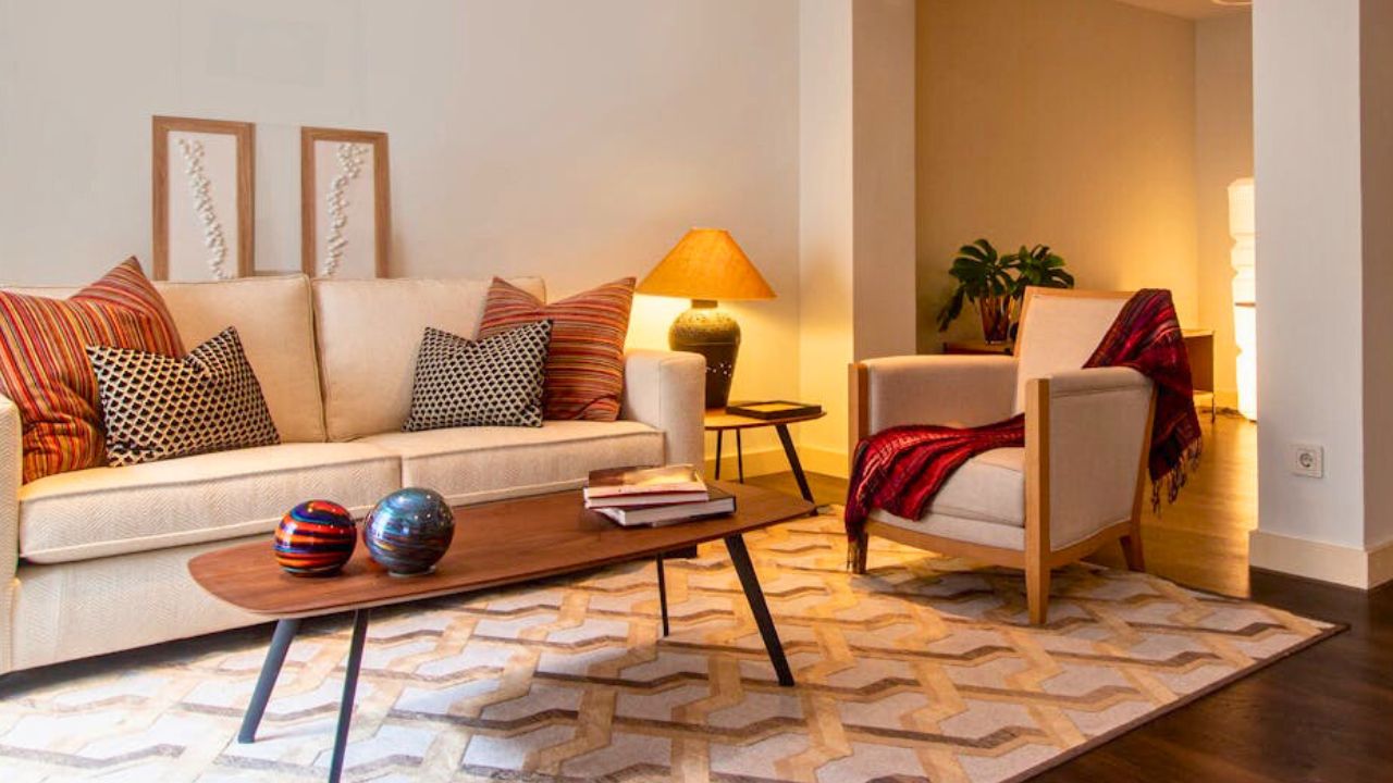 Break the cast with a large rug and repeat the floor tone in two small spots so it looks intentional.