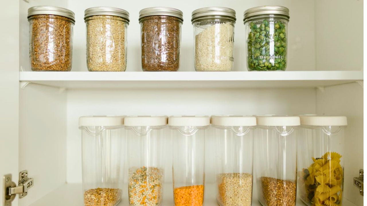 Decant pantry basics into clear jars. Use plain pumps for soap. Store refills in a labeled bin.
