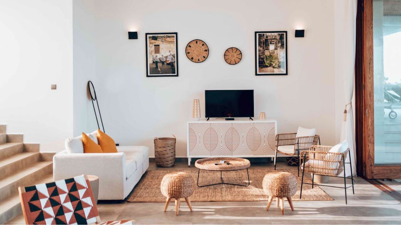 Pick two or three “house textures”—linen, rattan, matte black metal, raw wood—and let them reappear. Linen shows up in drapery and a throw. Rattan in a tray and a bench. Raw wood in a bowl and a console. Texture is how neutral homes feel connected without turning into duplicates.