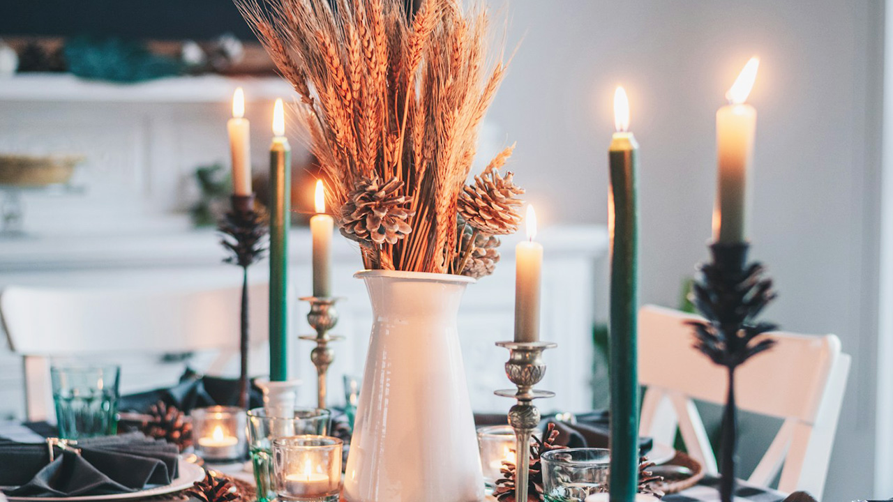 A few candles down the center of the table add more warmth than almost anything else. Mix short and tall candles so the light feels layered. Just keep flames away from where people reach for platters and pour drinks.