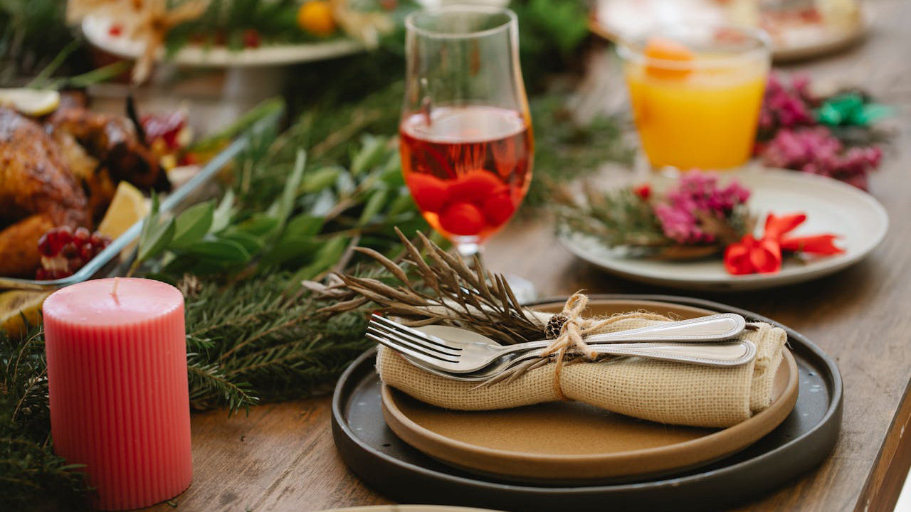 Start with a neutral base—wood table, simple runner, basic plates—then add small seasonal pieces: a bit of greenery on each plate, a small ornament near the glass, or a napkin in a holiday color.