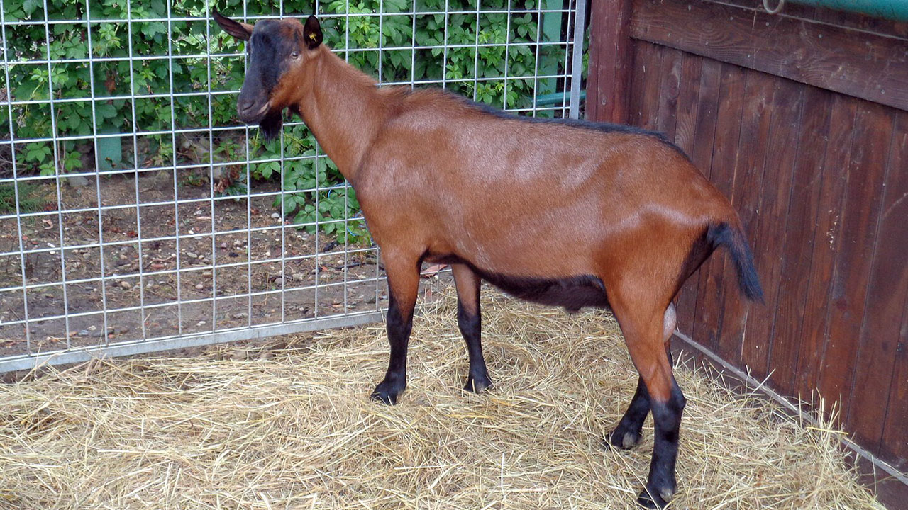 Oberhaslis are medium-sized goats with rich reddish-brown coats and black markings. They’re calm, hardy, and good milk producers.