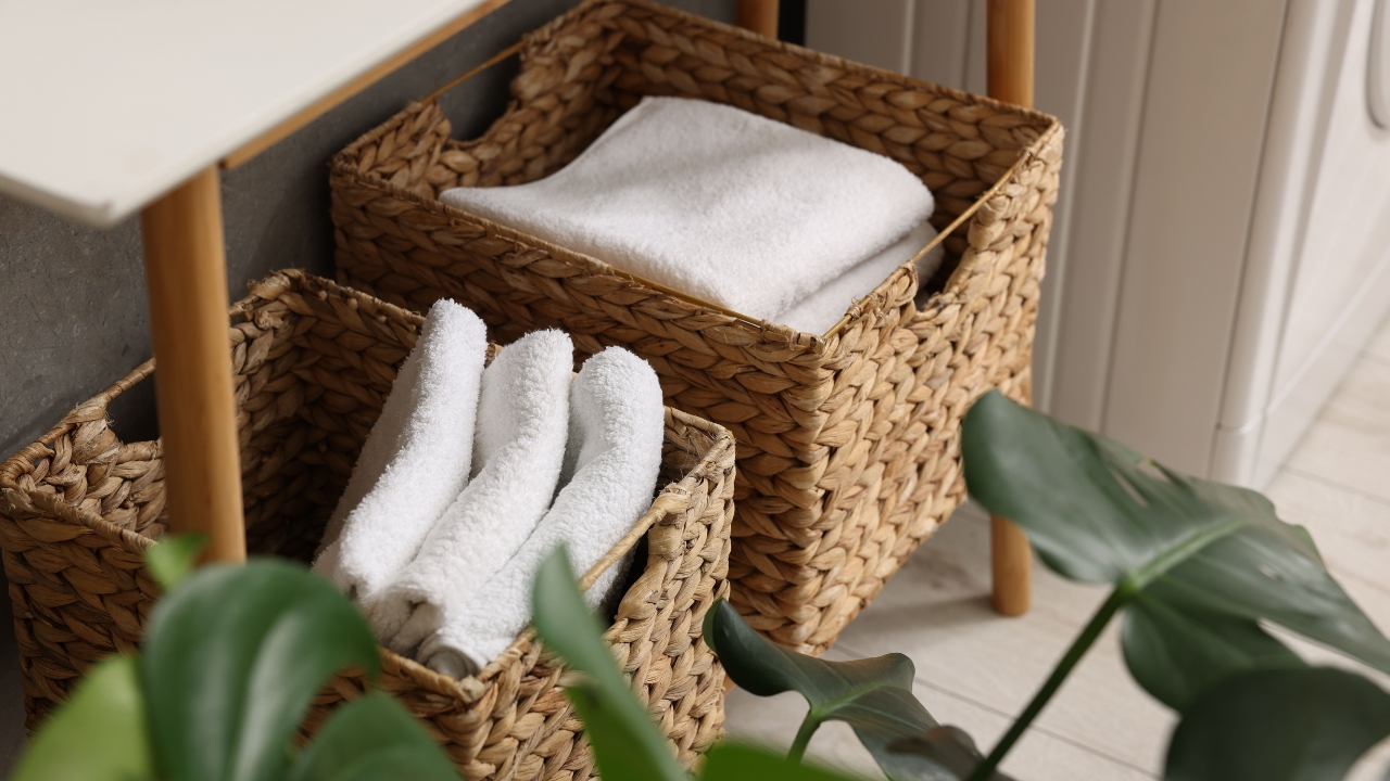 Hotels always showcase clean, fresh linens. Keeping folded towels on display in the bathroom or layering bedding in the bedroom gives the same feel.