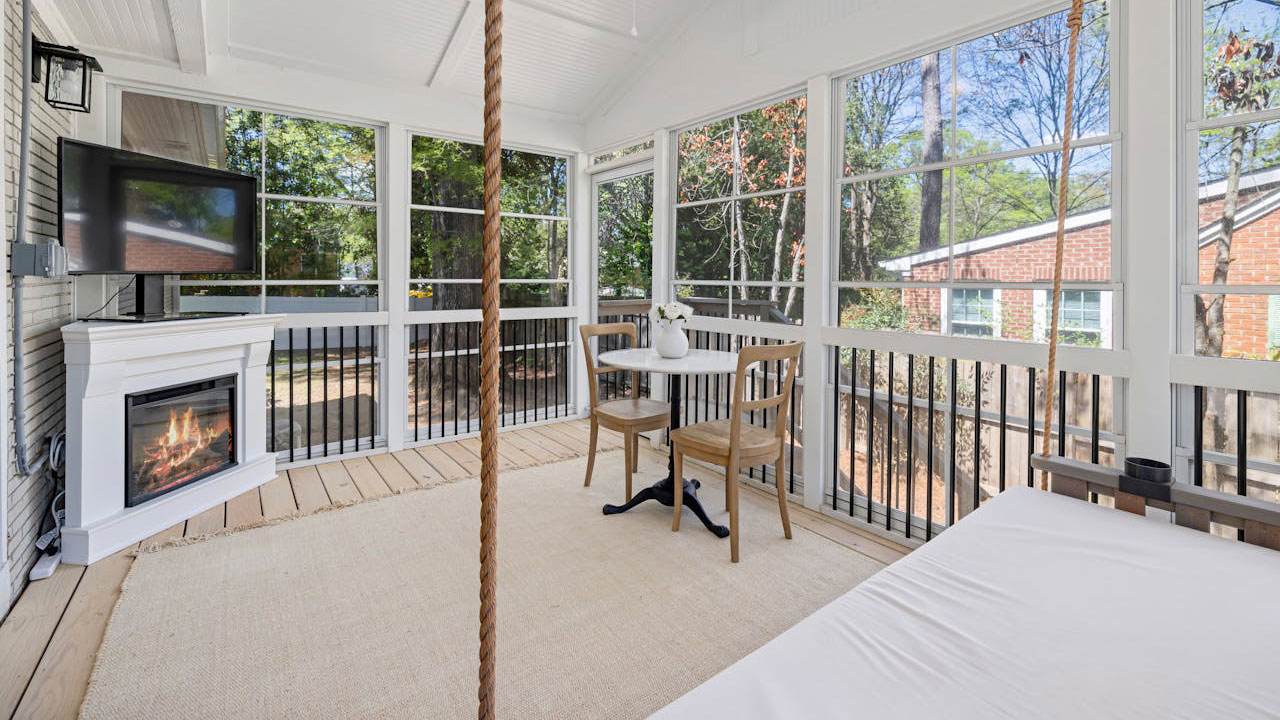 Covered patios with fireplaces, TVs, and lounge seating extend living space outdoors. These setups make a home feel designed for comfort year-round.