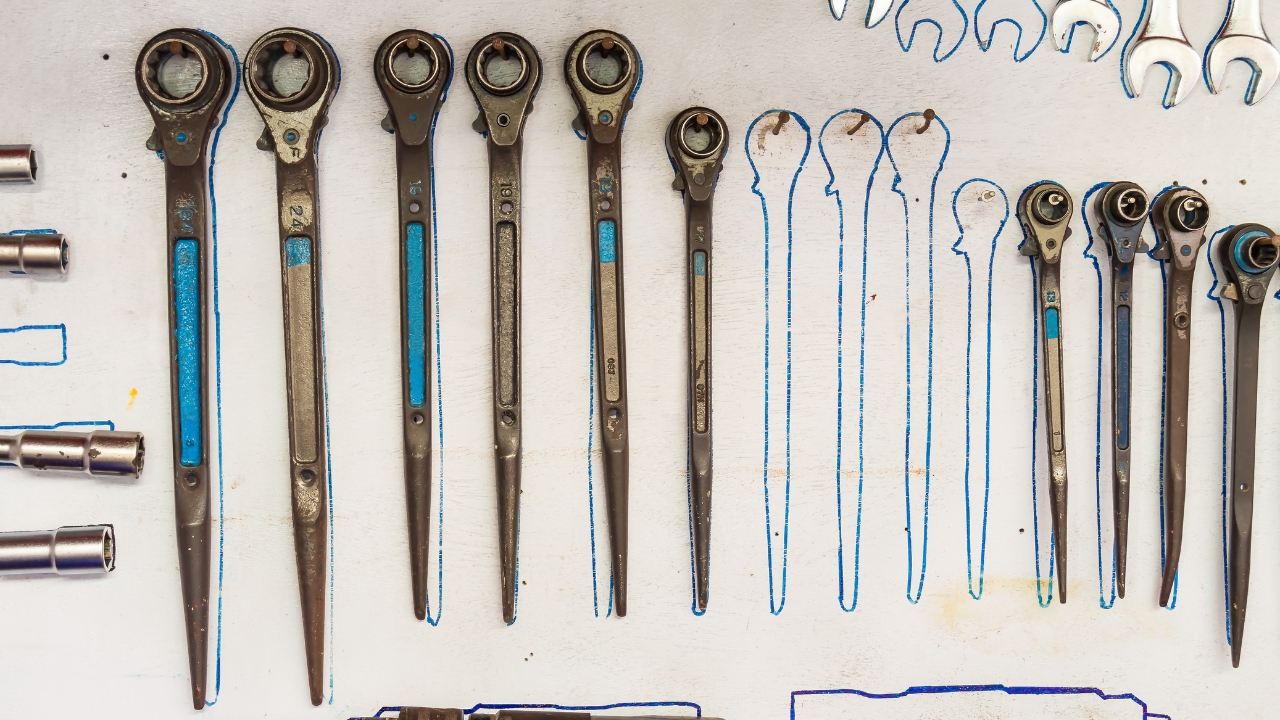 We built a basic plywood shadow board and outlined each hand tool with a marker so everything has a spot. No more guessing where the needle-nose pliers or utility knife wandered off to.