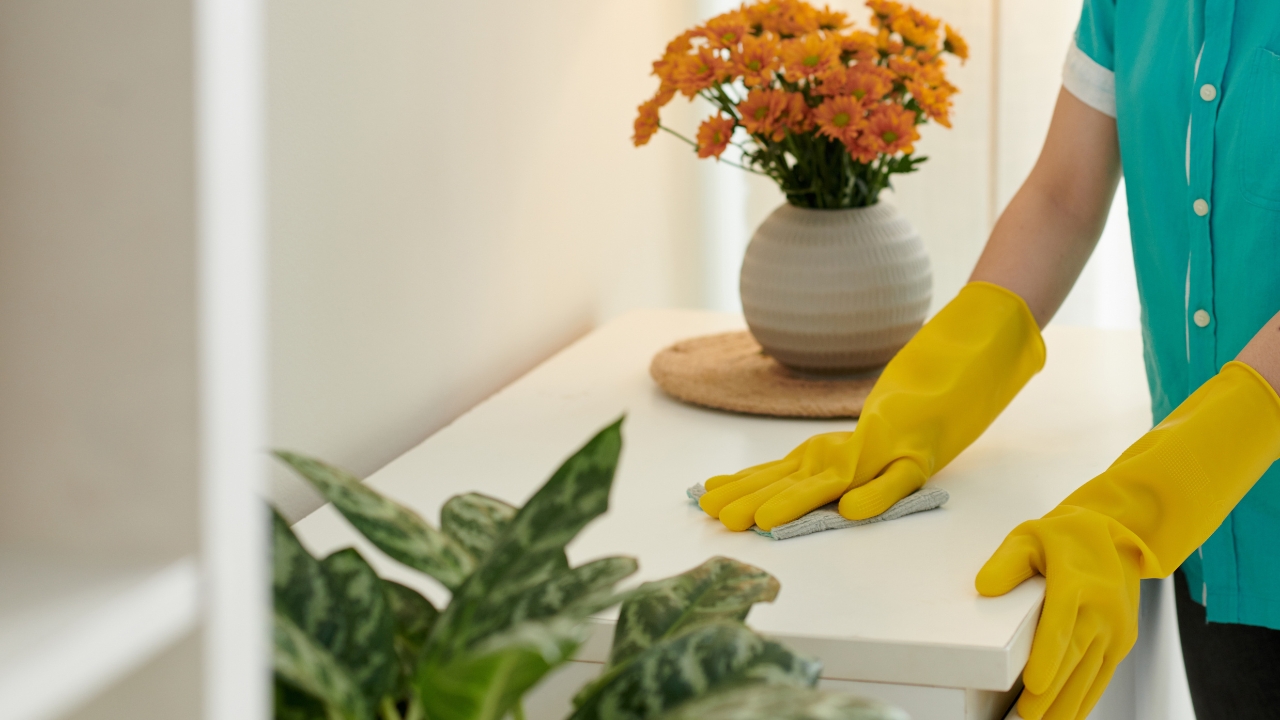 Grab a damp cloth and a gentle cleaner or disinfecting wipe, and run over the light switches and door handles in the main areas: entry, bathroom, kitchen, and wherever people will hang out. It takes just a couple of minutes and helps everything look fresher without much effort.