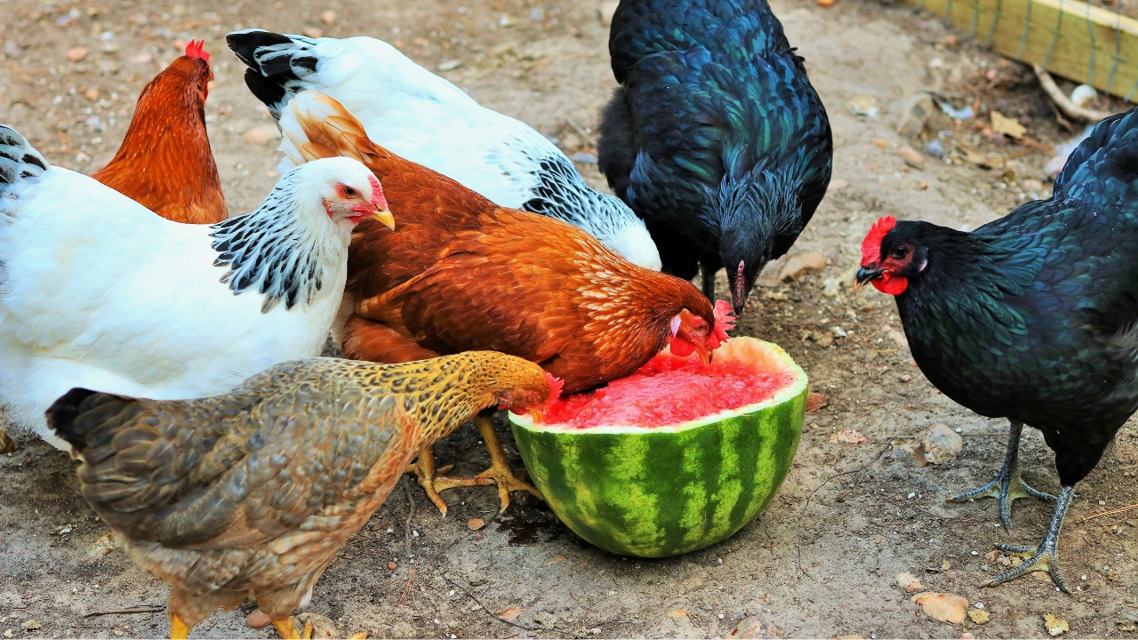 Apples (without seeds), berries, watermelon, bananas, and cantaloupe are popular chicken treats. They’re sweet and full of hydration—especially helpful during the summer heat.