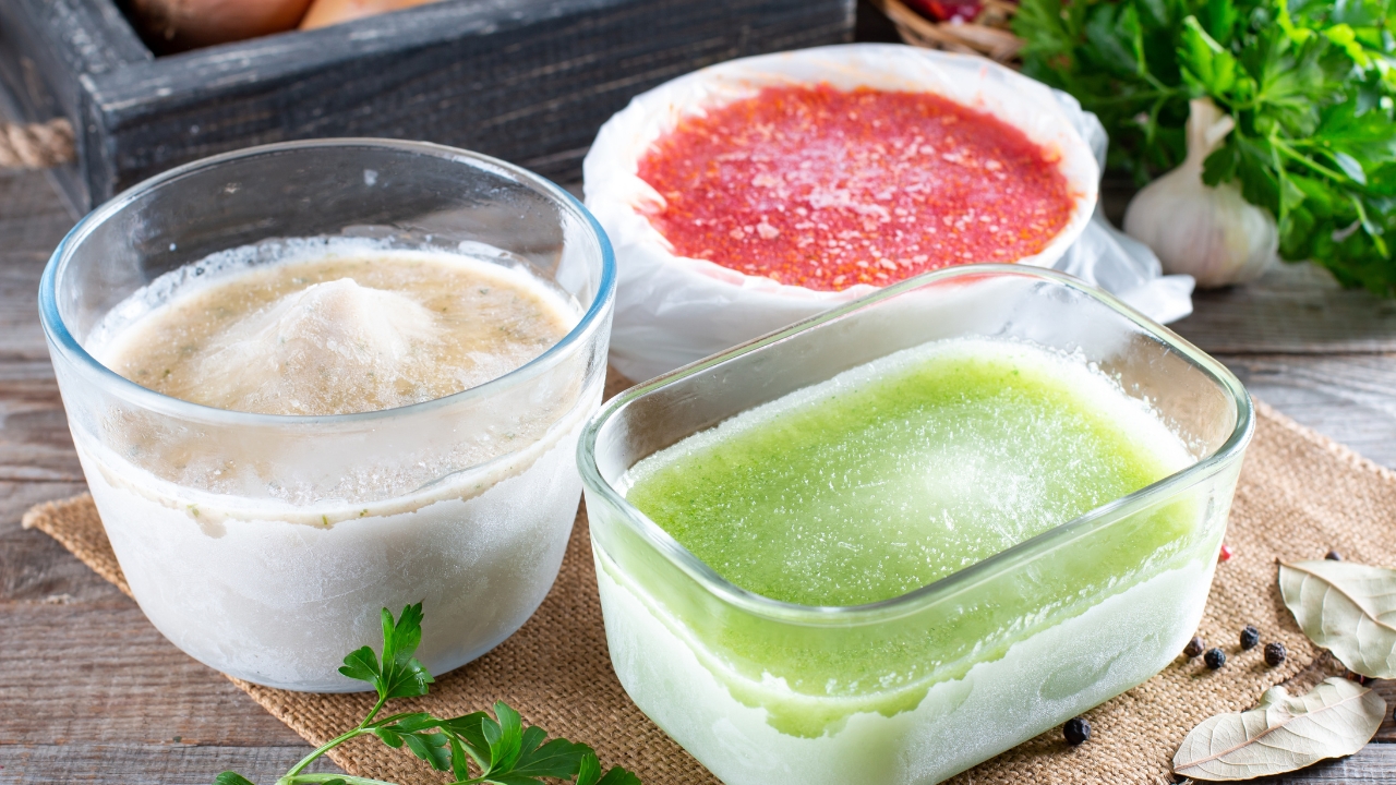Rigid, freezer-safe containers protect delicate soups with lots of veg, while bags are great for chilis and smooth purees. Silicone freezer trays make perfect 1-cup cubes for gravy or broth.