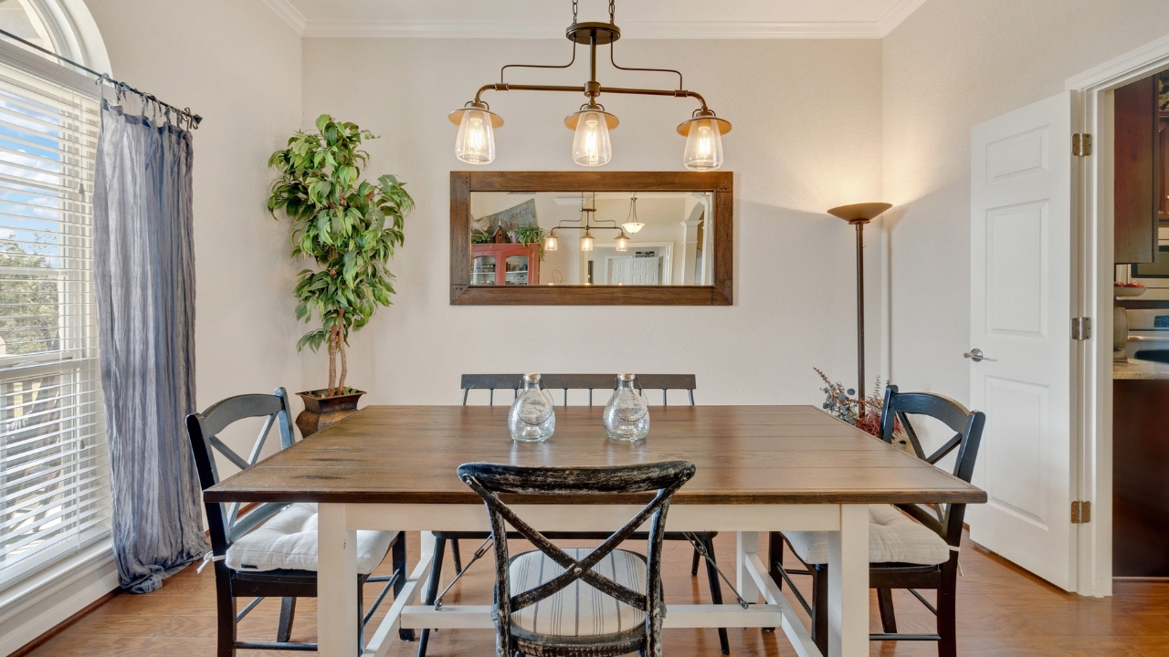 Empty walls make a dining room feel unfinished. One large piece of art, a mirror, or even a well-styled basket or cutting board can help tie the room together. The key is to fill the space above eye level without making it feel cluttered.